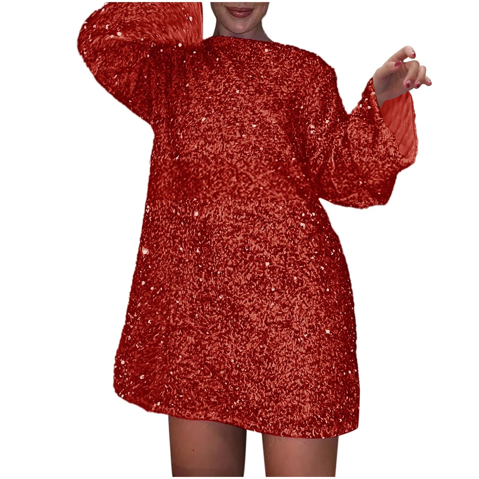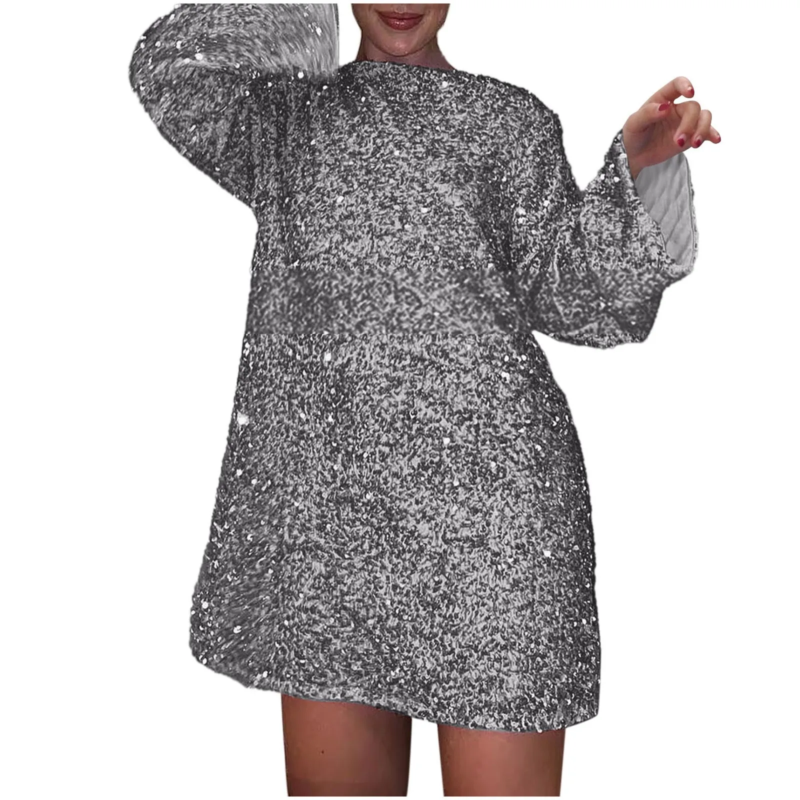 Women’s Autumn And Winter New Round Neck Long Sleeved Loose Oversized Sexy Sequin Short Dress