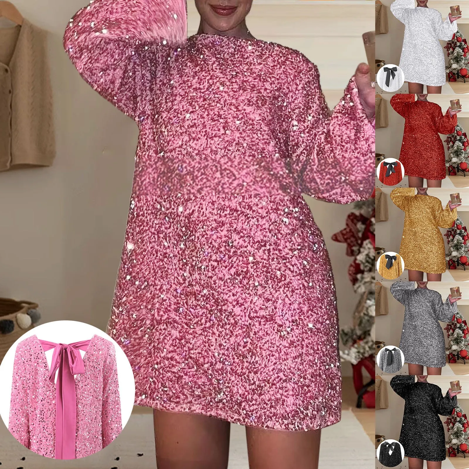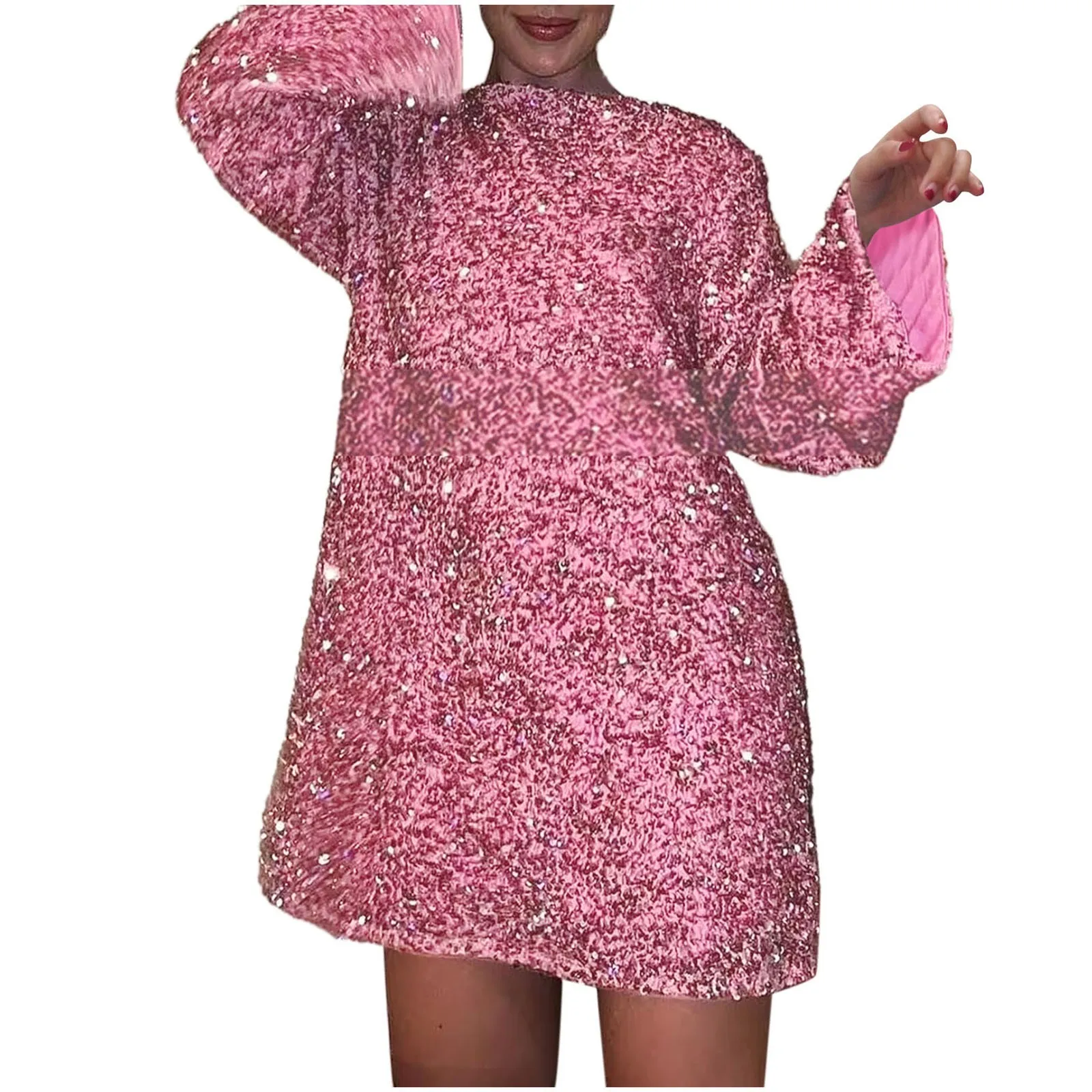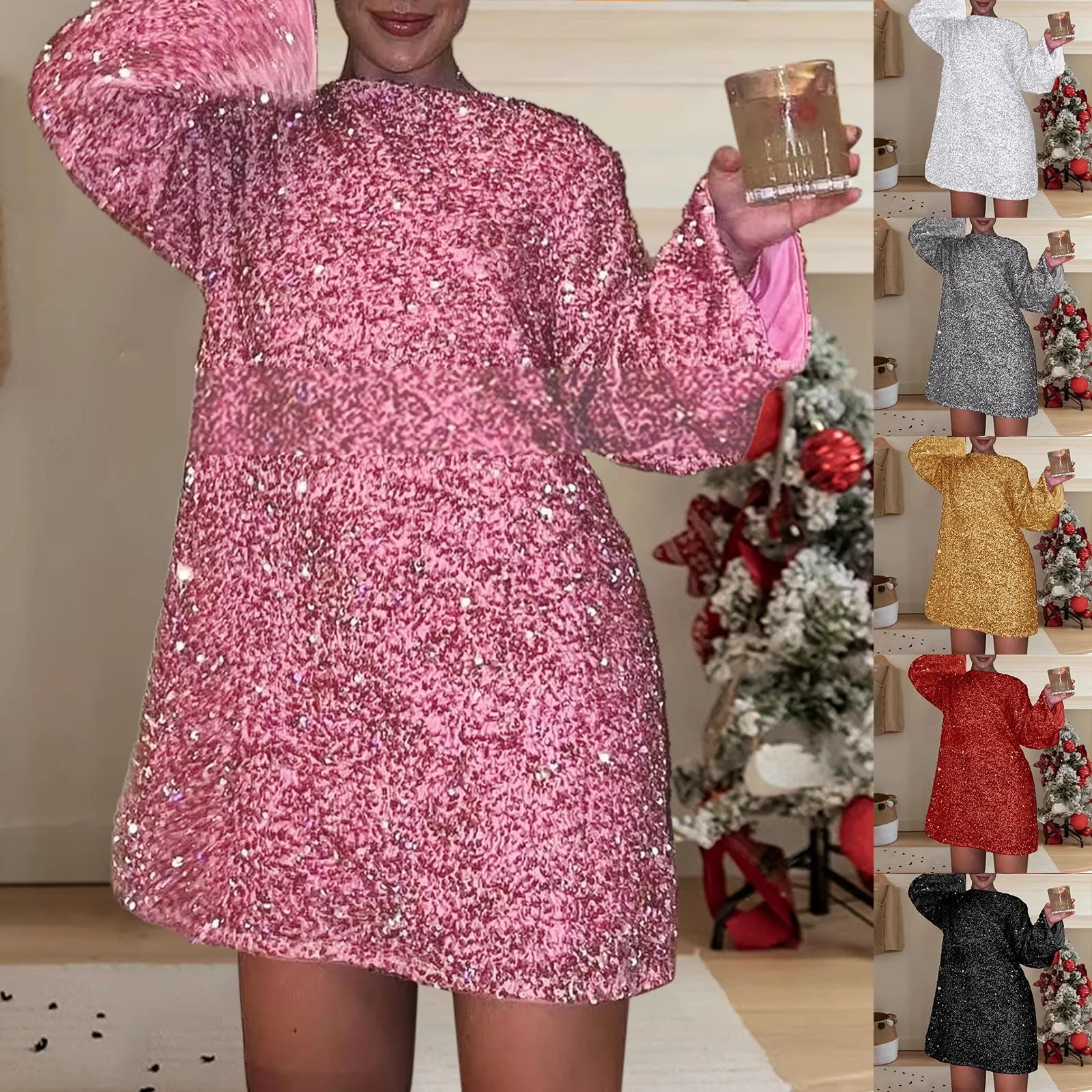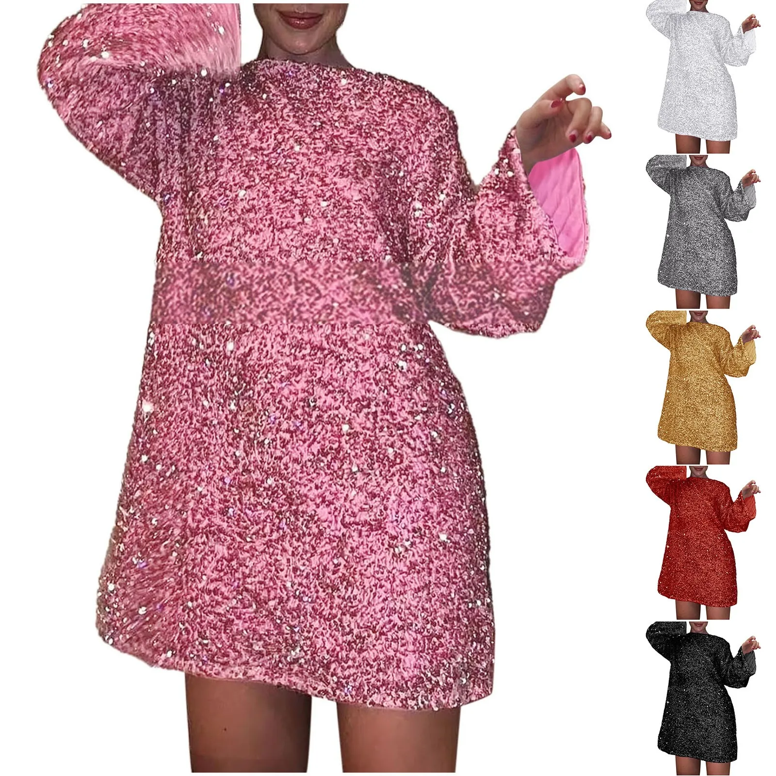 Women’s Autumn and Winter New Round Neck Long Sleeved Loose Oversized Sexy Sequin Short Dress