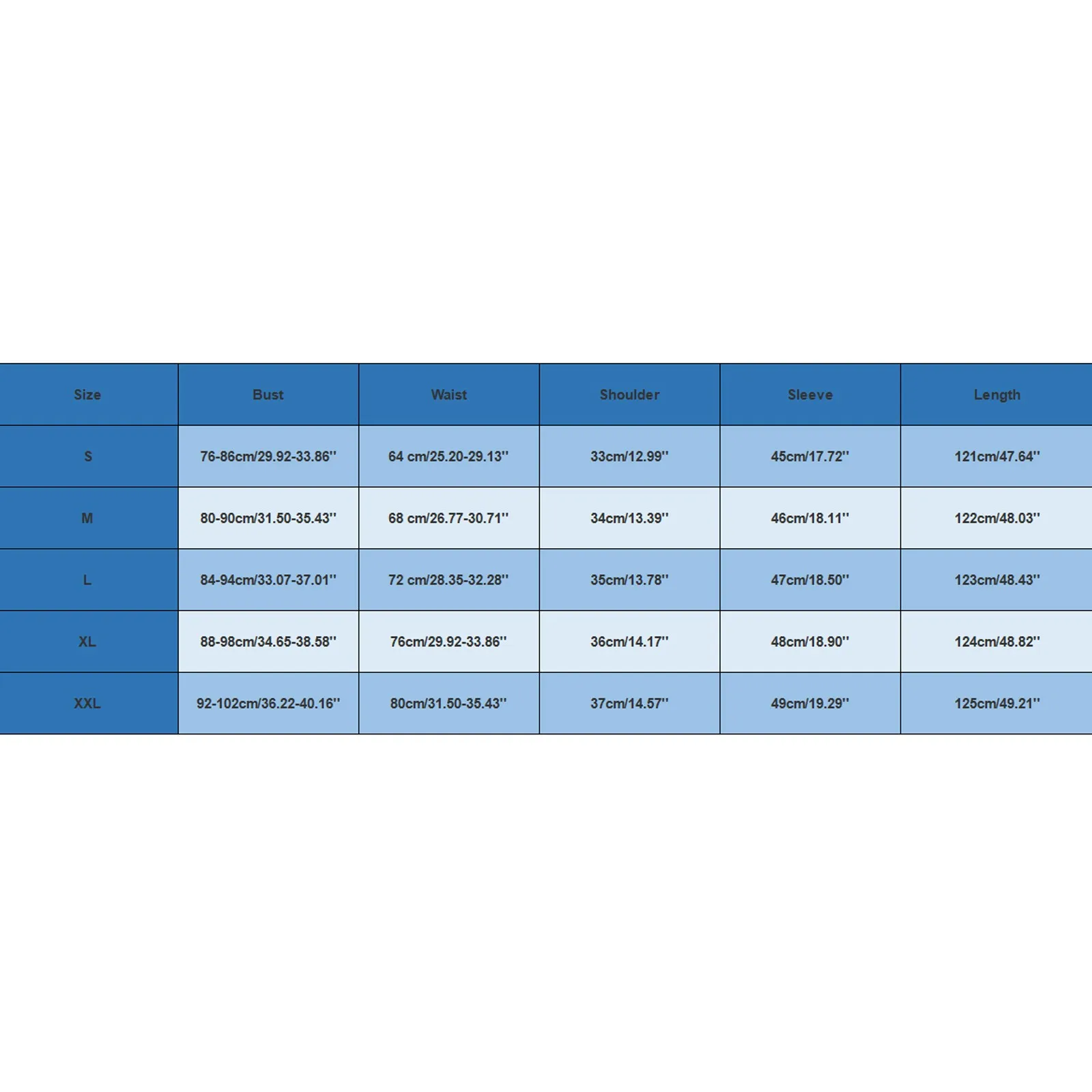Size:L | Bust:84-94cm/33.07-37.01” | Waist:72 cm/28.35-32.28” | Shoulder:35cm/13.78” | Sleeve:47cm/18.50” | Length:123cm/48.43” |