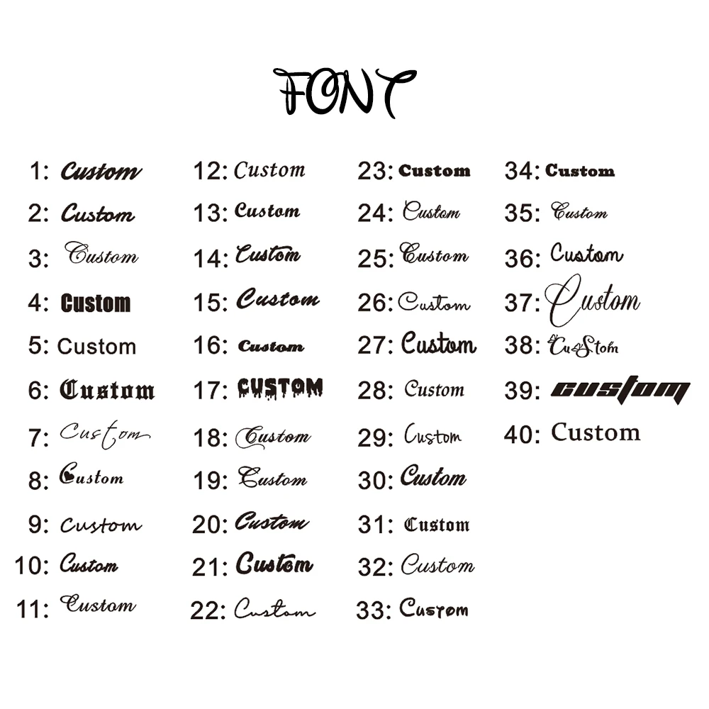 Friend,after you placed the order.please send us the name you want to customize.and choose a font type you like.(Such as:Lisa,font 7.)