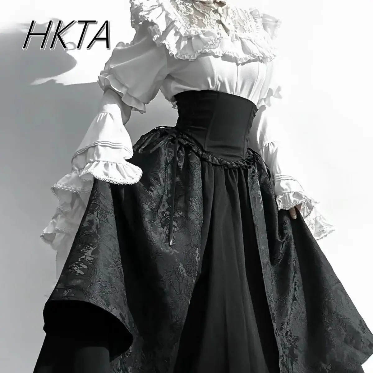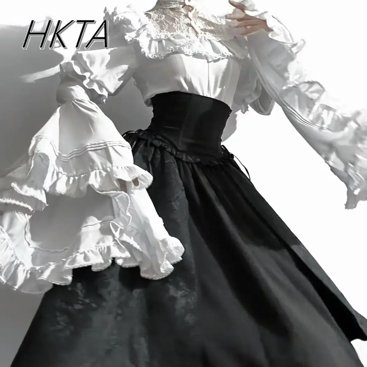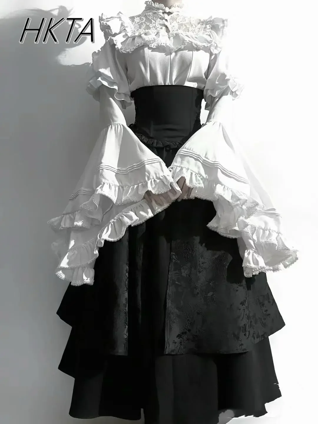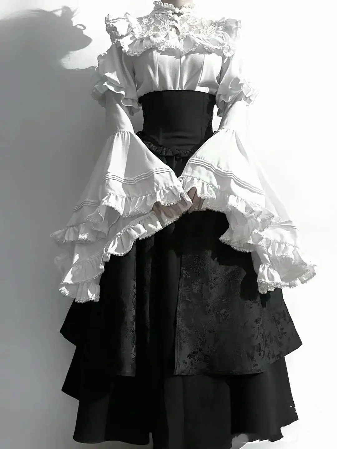 Gothic Shirt Y2k Top Lolita Girls Ruffle Umbrella Skirt High Waist Oversized Long Skirt Horn Long Sleeve Student Elegant Blouse