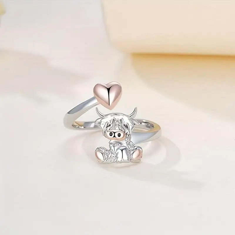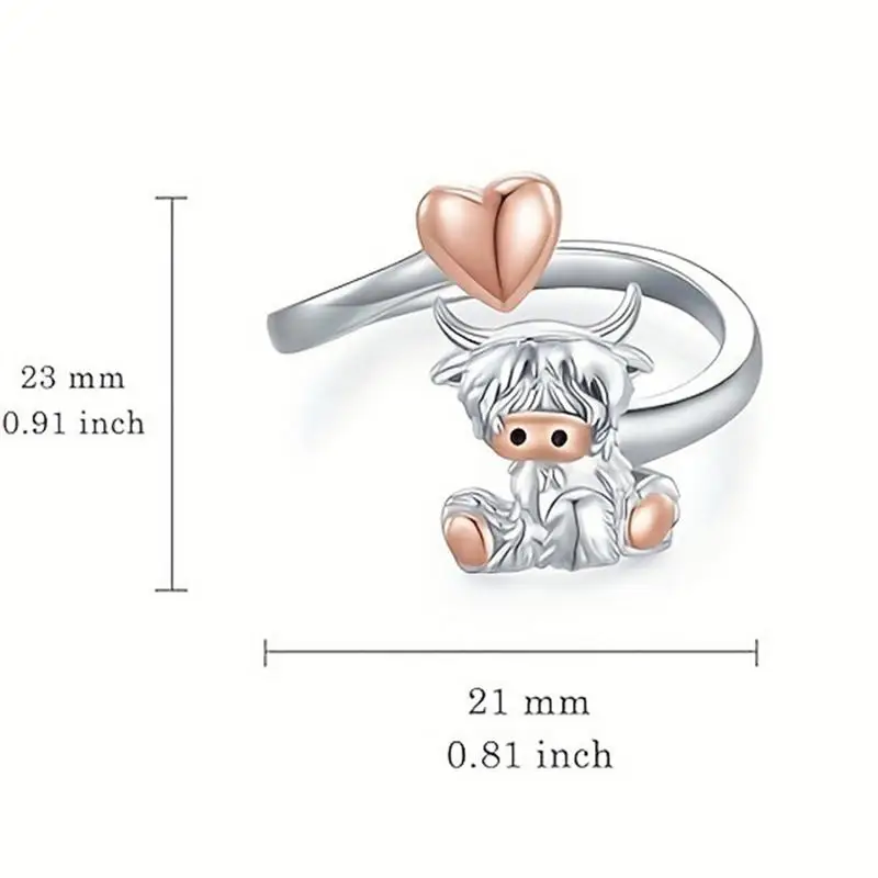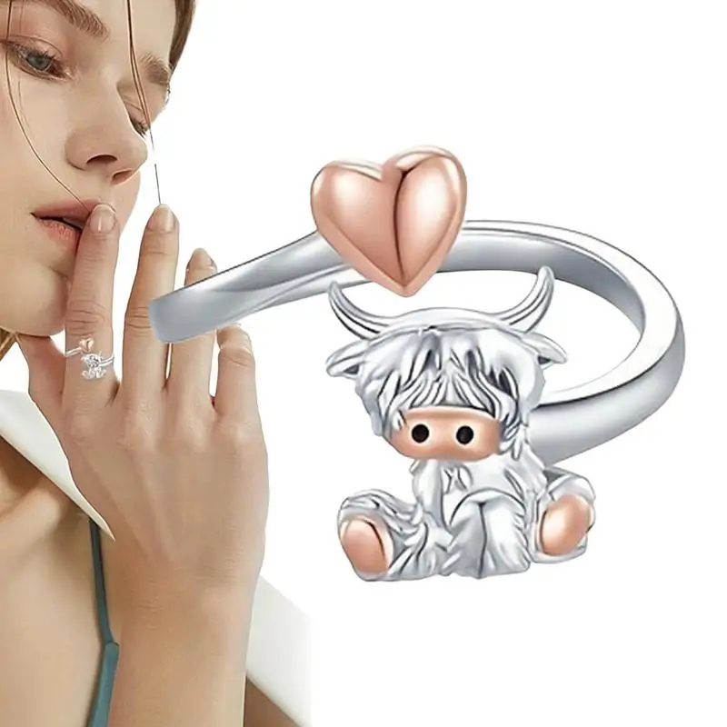 HighlandCow Ring Cute Adjustable Open Ring Jewelry with Loving Heart Romantic Cow Jewelry Gifts for Women Girls Animal Lover