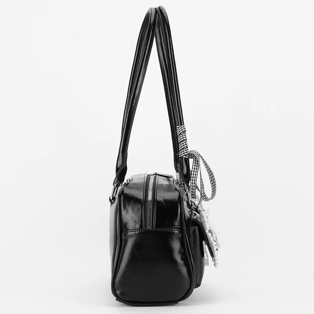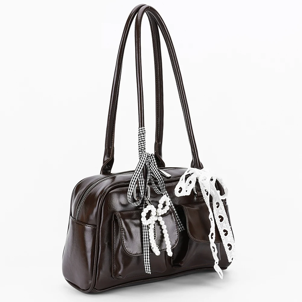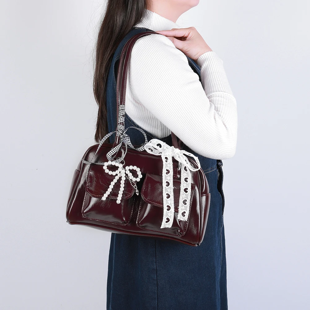 Y2K Shoulder Bag for Women Bow Knot Underarm Bag PU Leather with Inner Pocket Boston Bag Zipper Closure Handbag for Work Travel