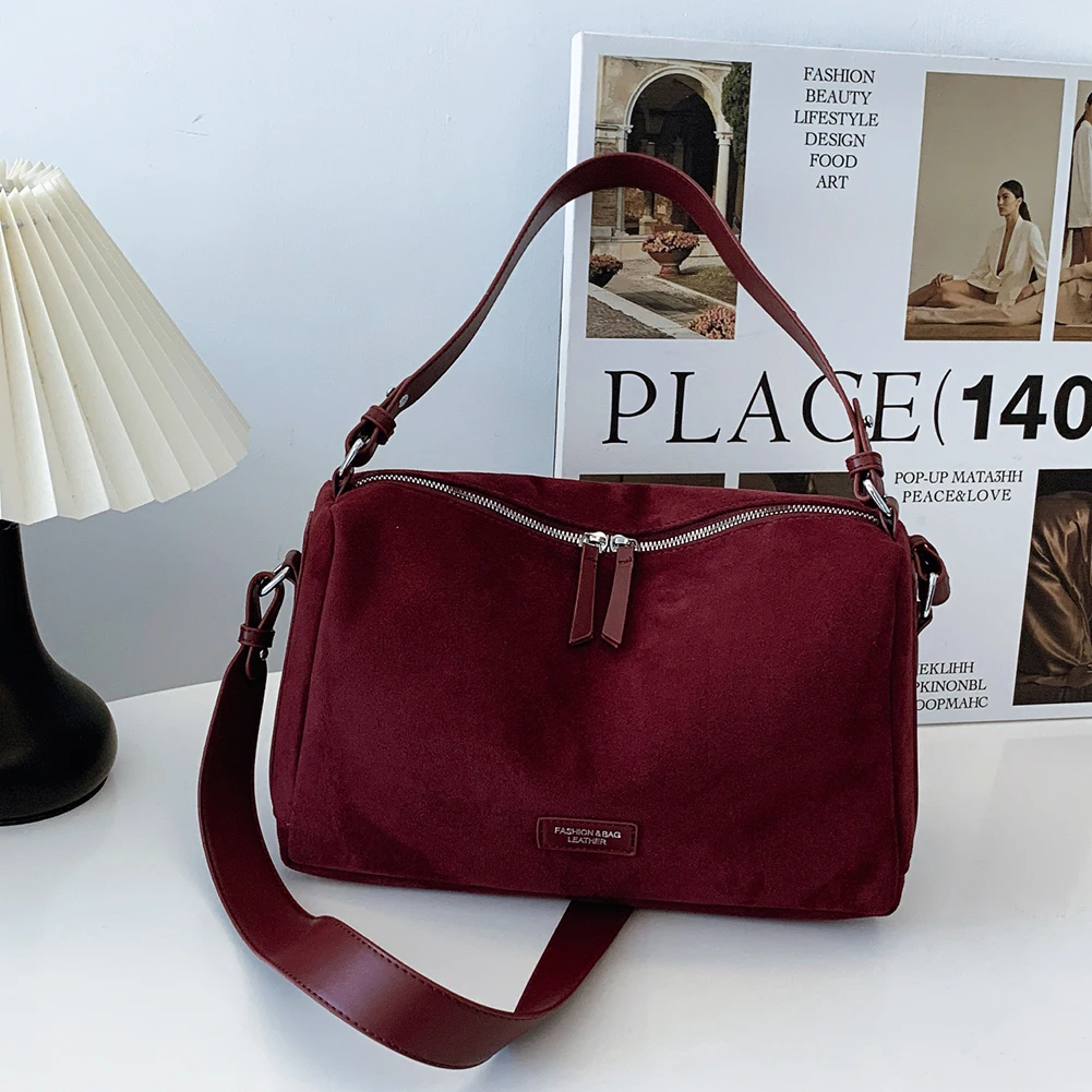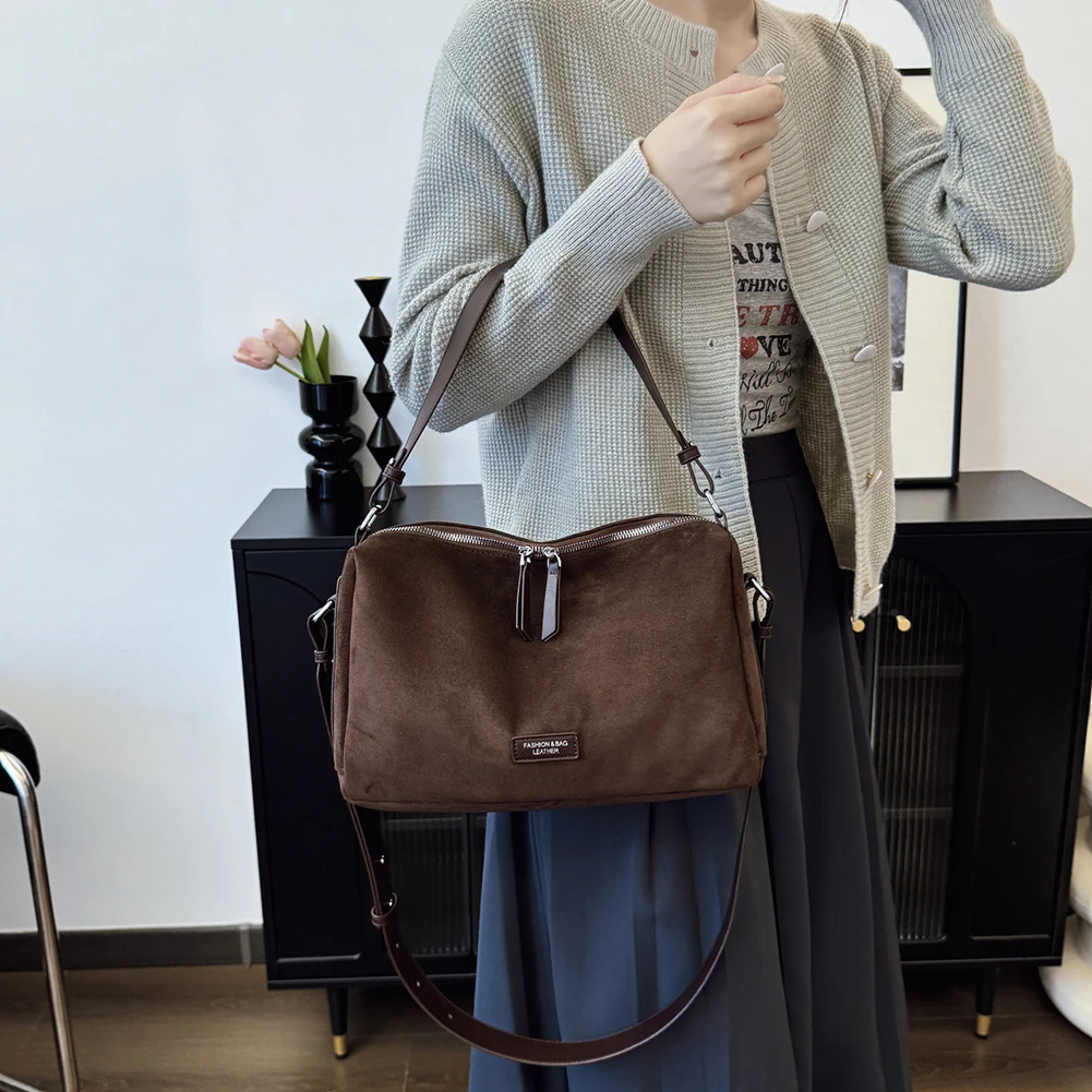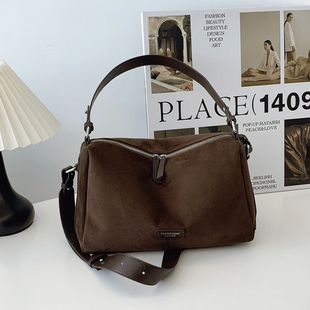 Ladies Faux Suede Handbag Adjustable Strap Women Crossbody Bag Vintage Solid Commuting Bag Zip Closure Daily Shoulder Bag Purses