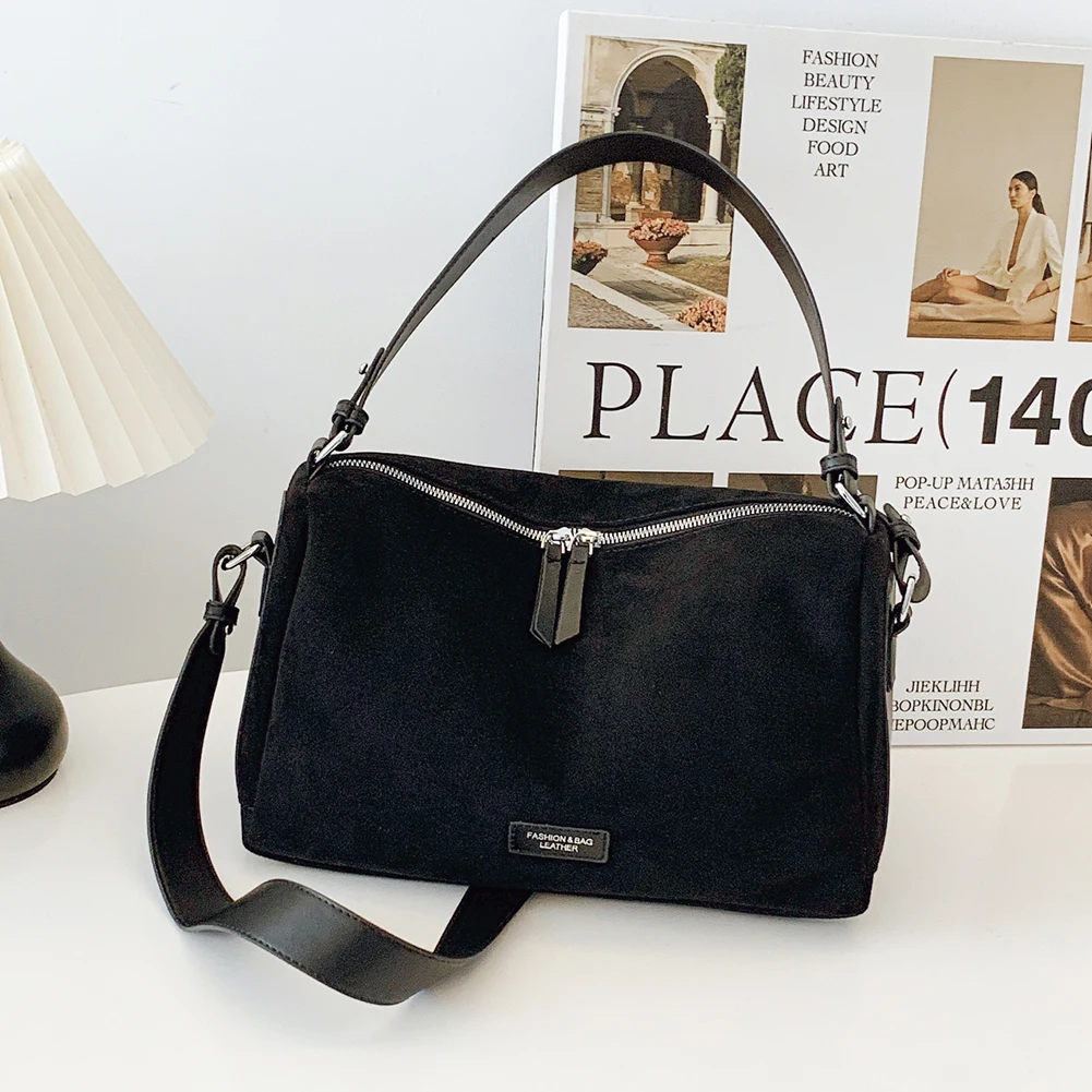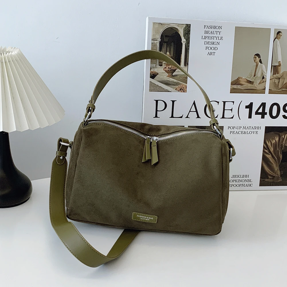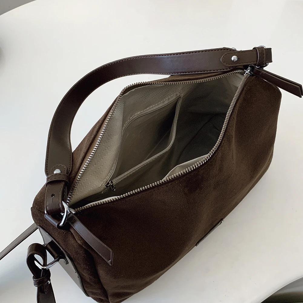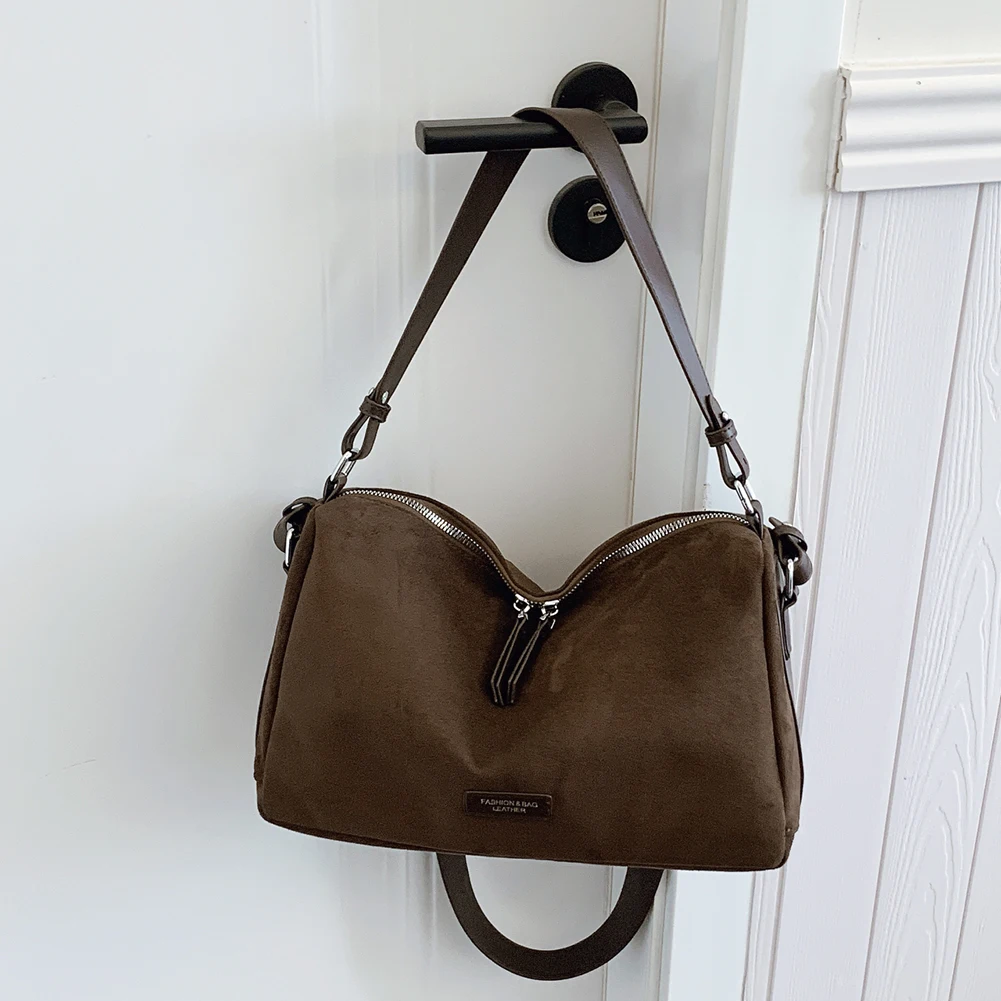 Ladies Faux Suede Handbag Adjustable Strap Women Crossbody Bag Vintage Solid Commuting Bag Zip Closure Daily Shoulder Bag Purses