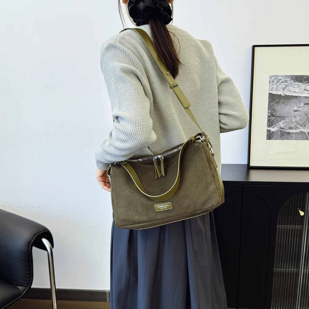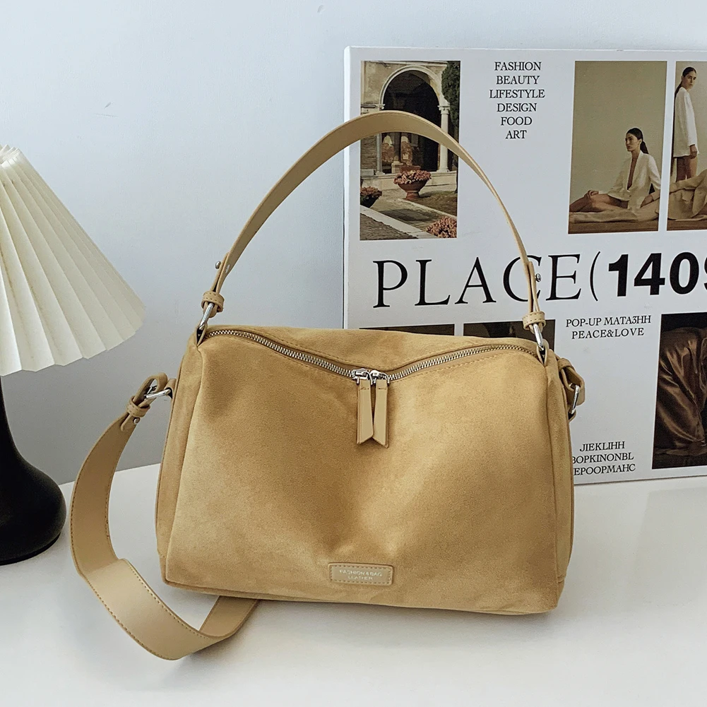 Women Faux Suede Fashion Shoulder Bag Adjustable Strap Stylish Messenger Bag Zip Closure Simple Crossbody Bag Trendy Satchel Bag