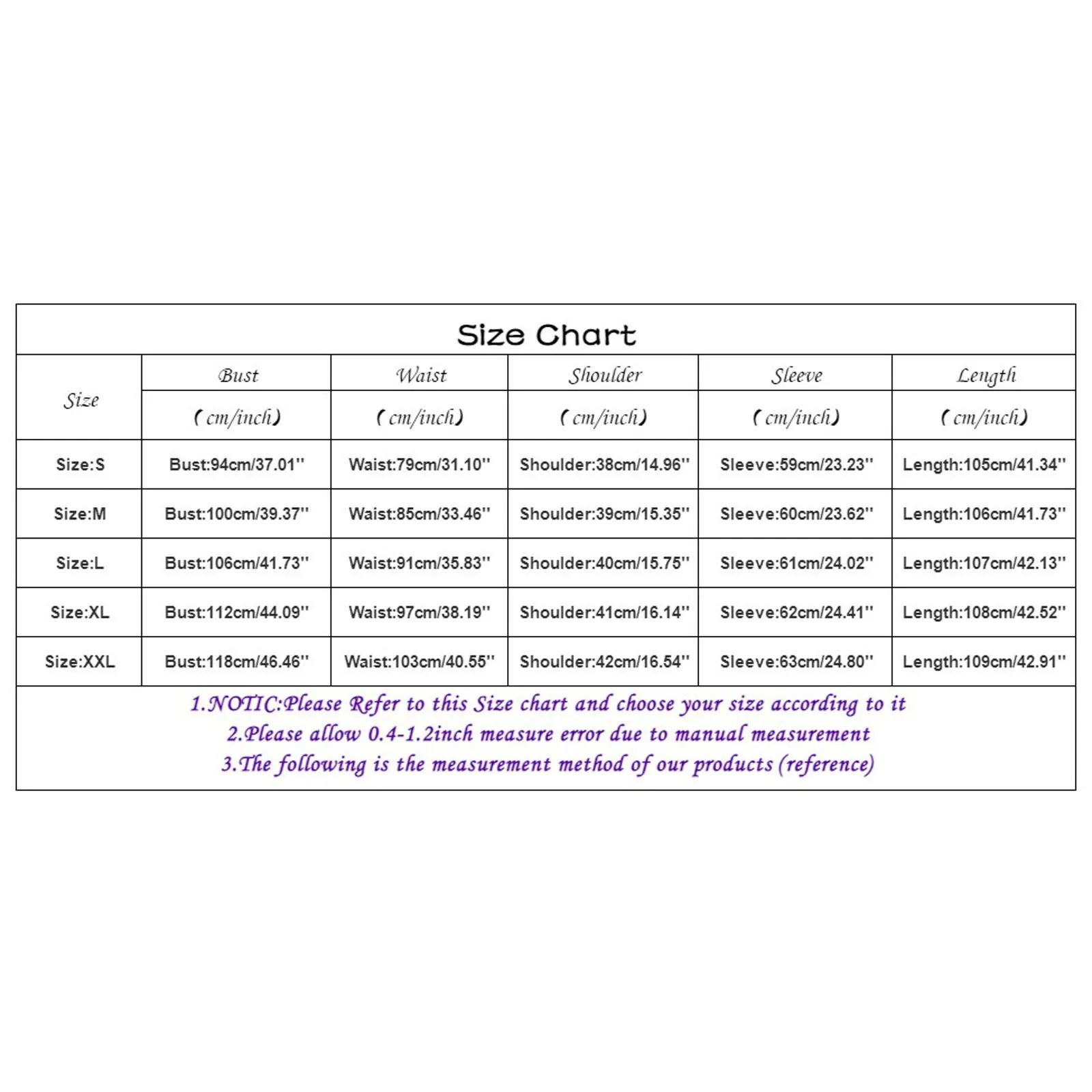 Size:XL | Bust:112cm/44.09” | Waist:97cm/38.19” | Shoulder:41cm/16.14” | Sleeve:62cm/24.41” | Length:108cm/42.52” |