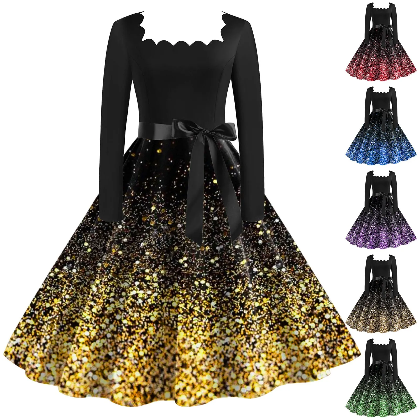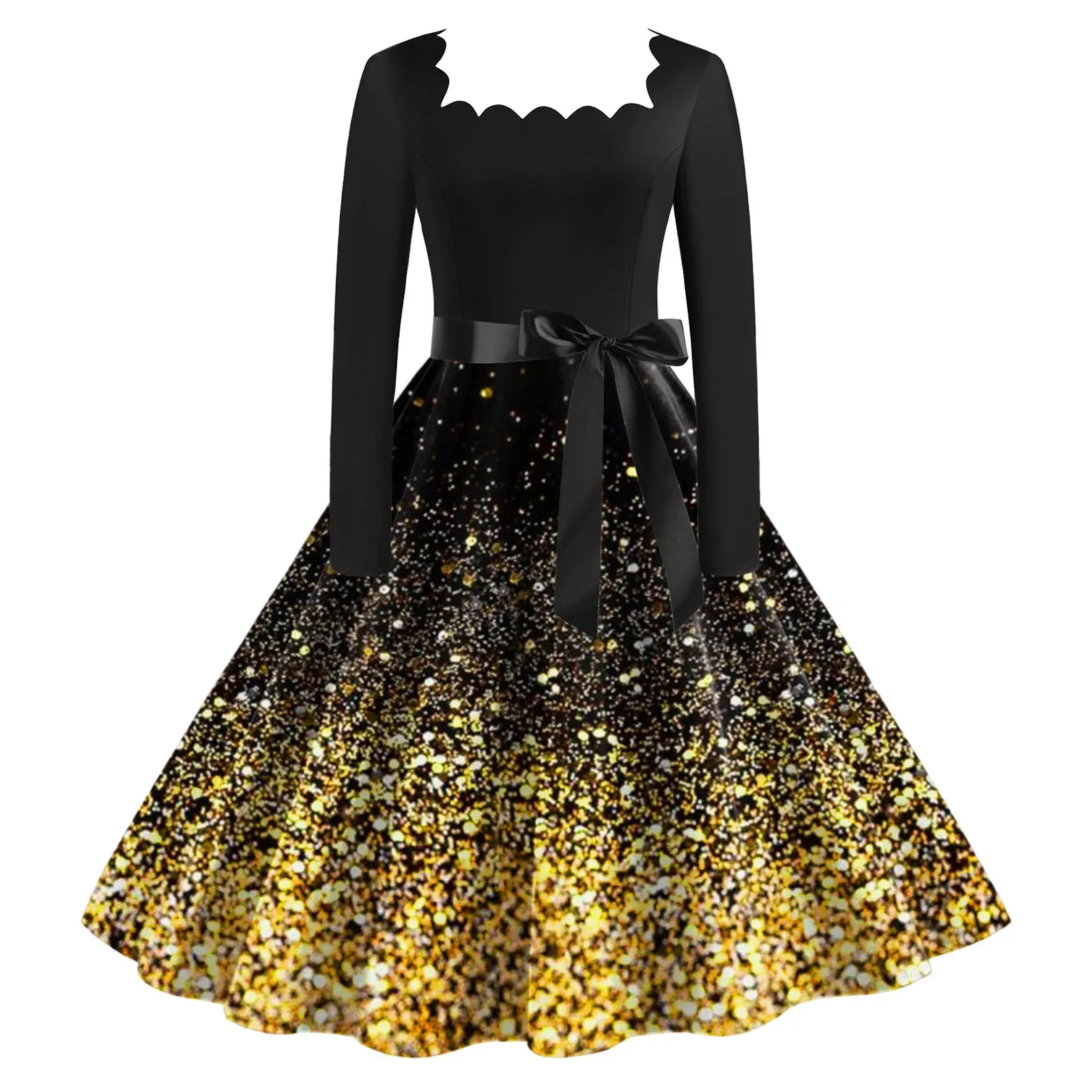 Long Sleeve Belt Cocktail Large Swing Dresses Christmas Theme Print Classic Midi Dress Women Party Formal Elegant Slim Dress