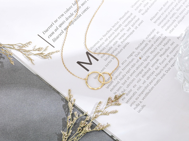 Celebrate your love with a beautiful handmade necklace or a set of 2. The unity link infinity circle pendant represents an eternal bond between a mother and daughter. A thoughtful and meaningful gift for Mother’s day, mom’s birthday, daughter’s birthday or for your mother on your wedding day. 14K gold vermeil and sterling silver rings are soldered in our studio and hand textured with a tiny hammer to create one of a kind pendant. The circles are suspended on dainty but strong chain to create an ethereal “floating” look.