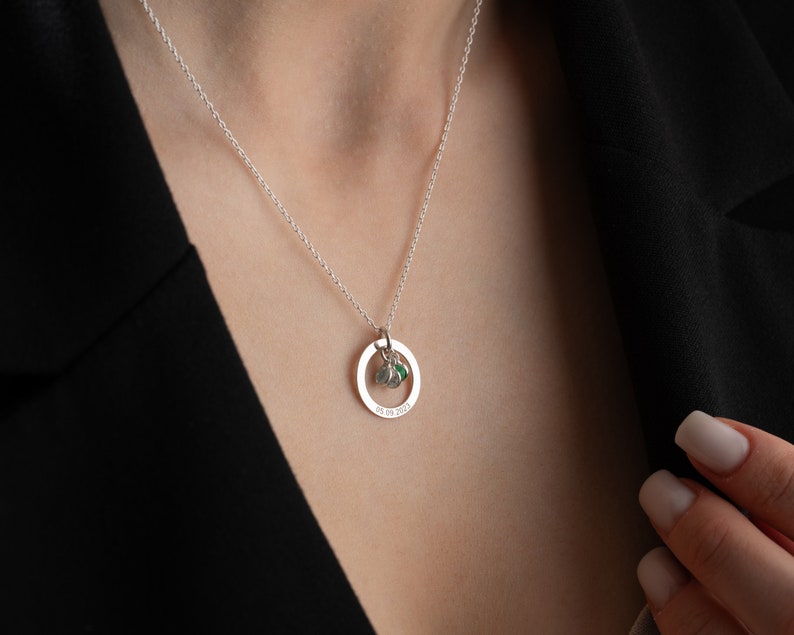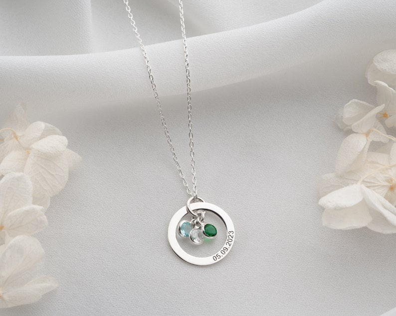 Our birthstone necklace, which we produce as Sterling Silver, will be a great gift for women. Circle and Family Birthstone Necklace is perfect for pulling the whole family together. Represent loved ones in birthstones and engrave a name or quote around the edge of the circle. A wonderful Birthday gift for a loving mum or grandmother to represent her unique family.