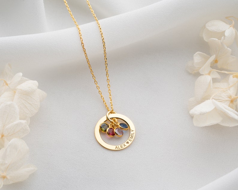 Personalized Gold Birthstone Necklace Women Name Necklace with Birthstone Circle Necklace Message Engraved on Circle Silver Engraved Jewelry