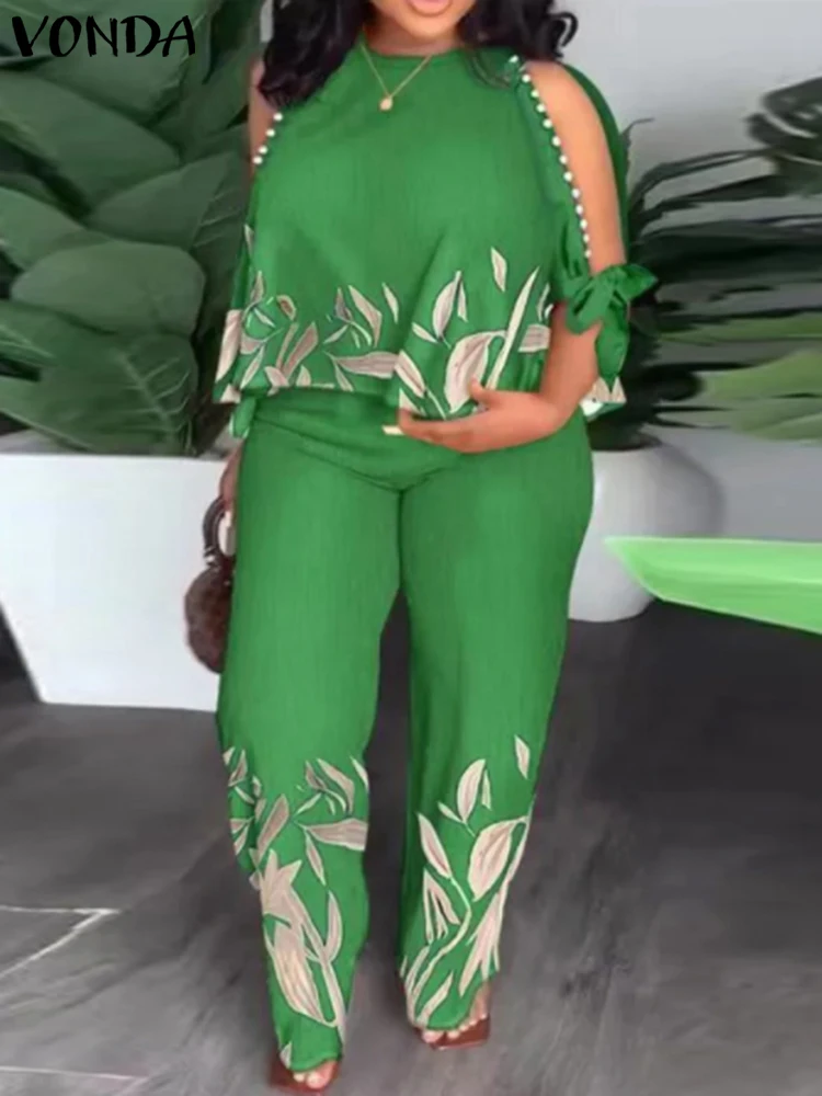 Plus Size 5XL VONDA Pant Set Cold Shoulder 2pcs Casual 3/4 Sleeve Tops Printed Bohemian Matching Sets