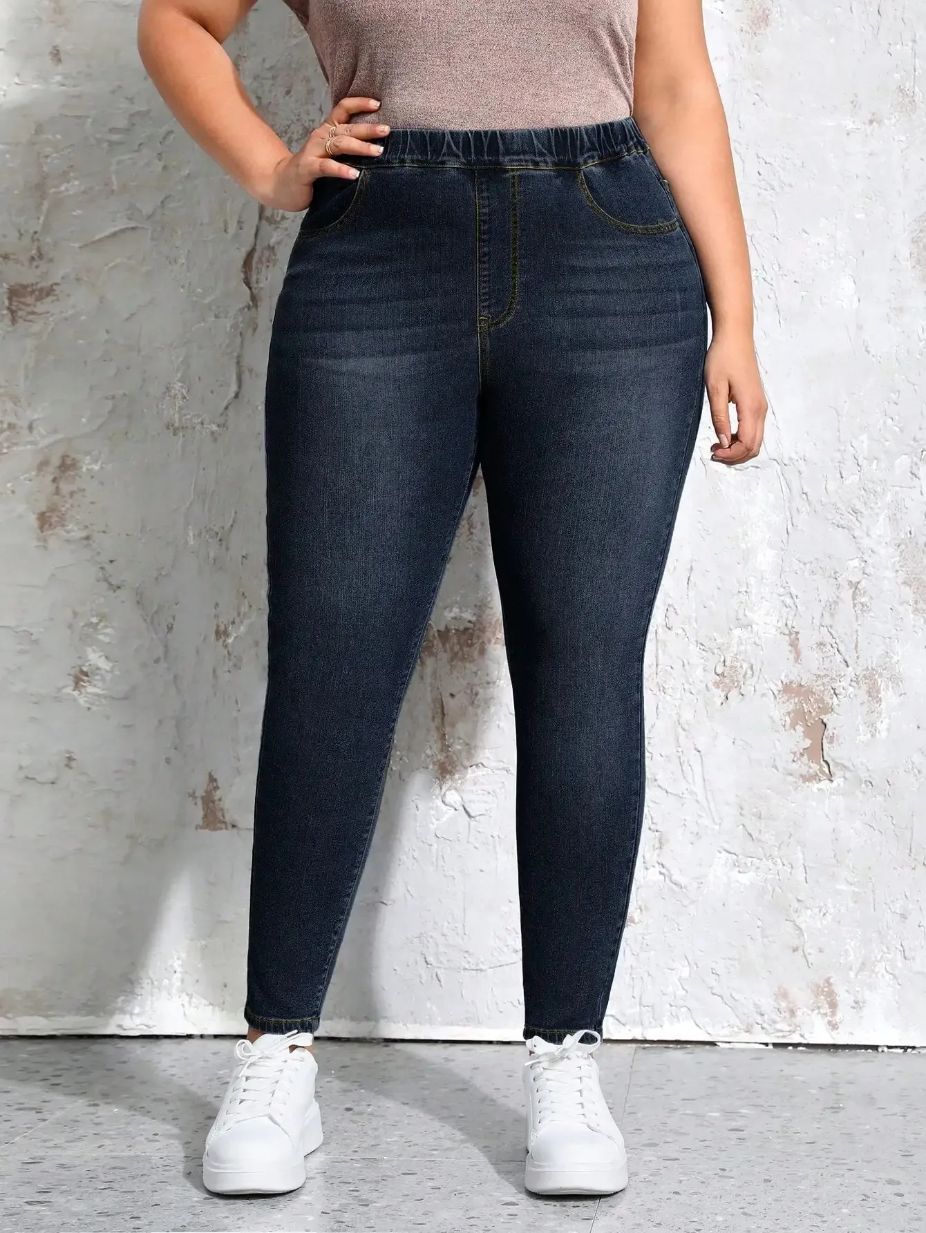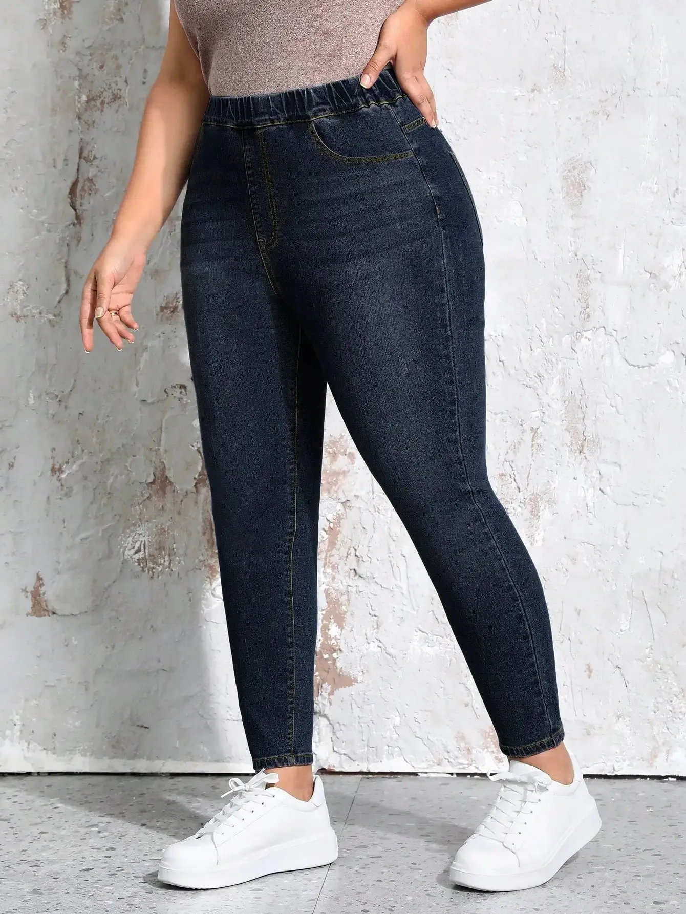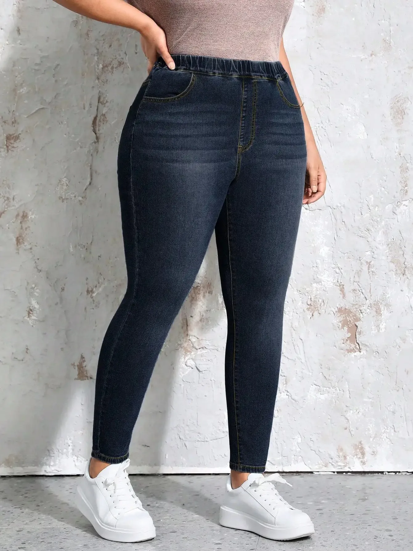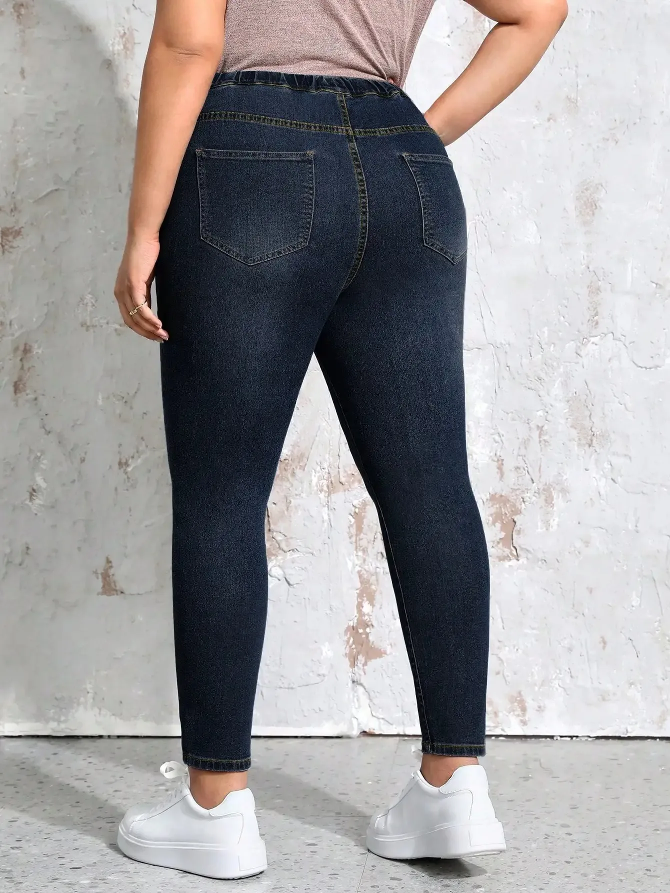 Details:Button,Pocket Closure Type:Elastic Waist Color:Dark Wash Pattern Type:Plain Type:Skinny Temperature:Late Fall (10-17℃/50-63℉) Waist Line:High Waist Length:Long Fit Type:Skinny Fabric:Medium Stretch Material:Denim Composition:65% Cotton,28% Polyester,5% Viscose,2% Elastane Care Instructions:Machine wash, do not dry clean Pockets:Yes Sheer:No