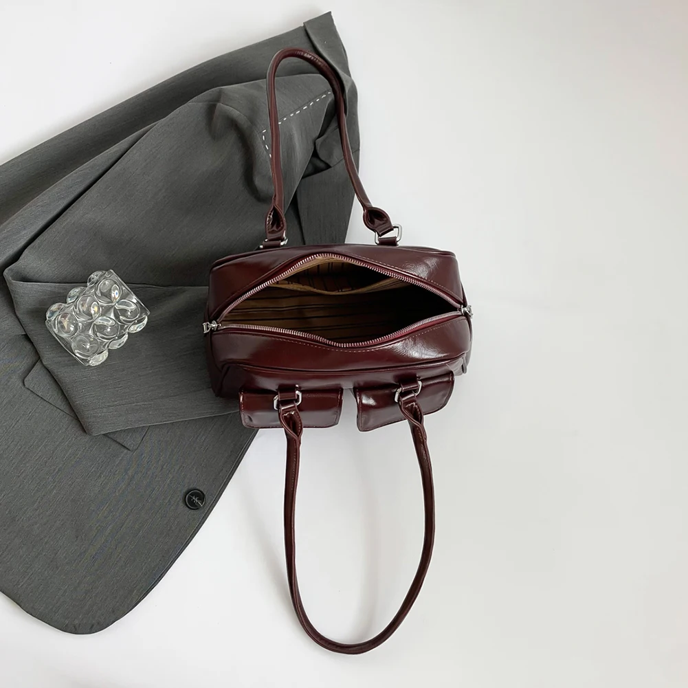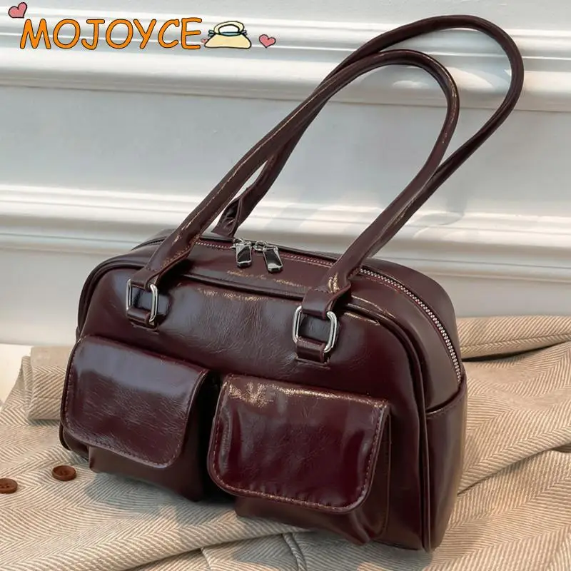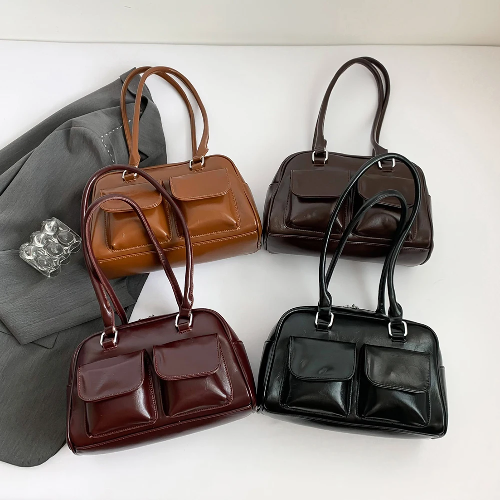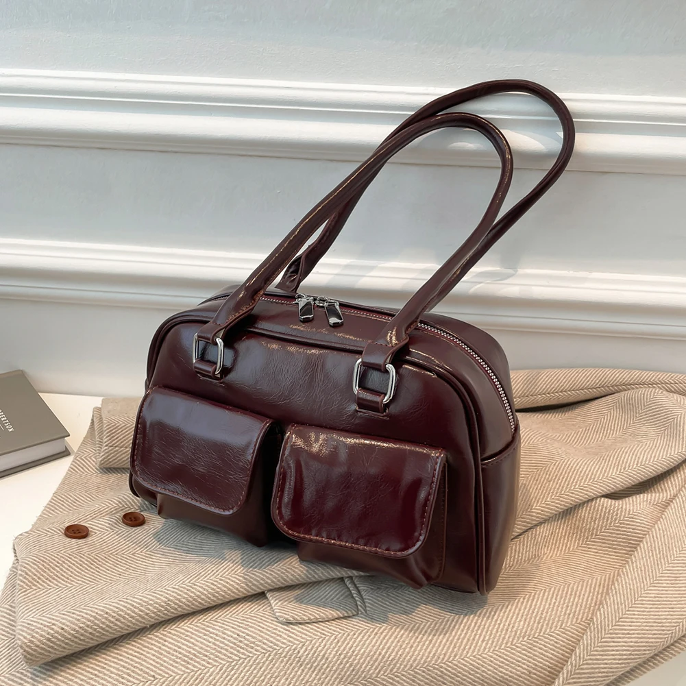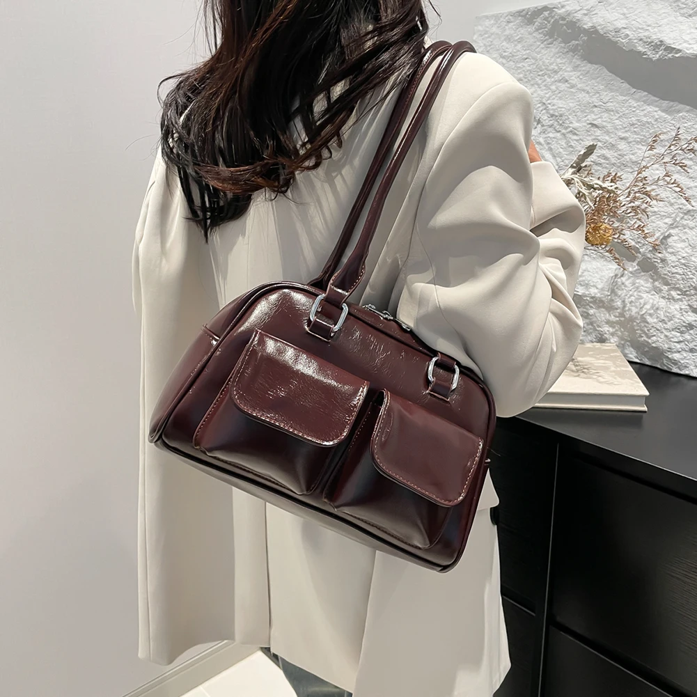 Retro Solid Bowling Bag Women’s PU Leather Vintage Shoulder Bags Multi pockets Tote Handbag Large Capacity Underarm Bag Hobo Bag