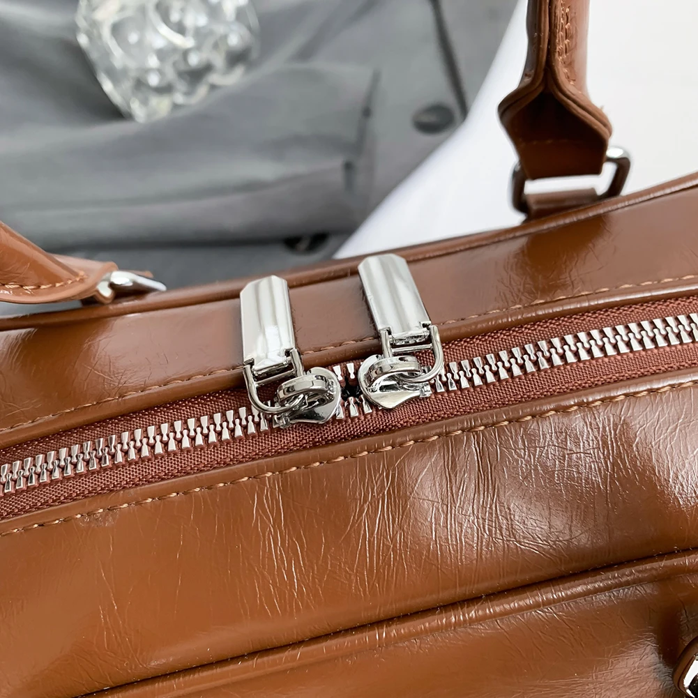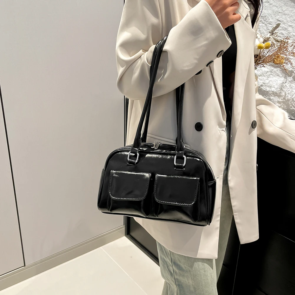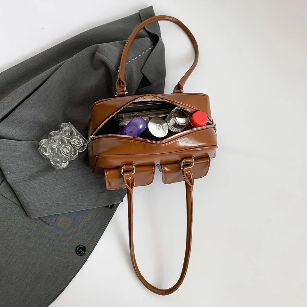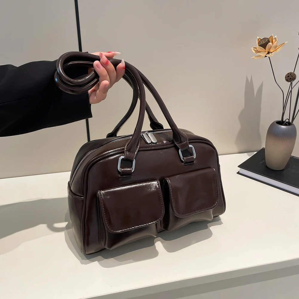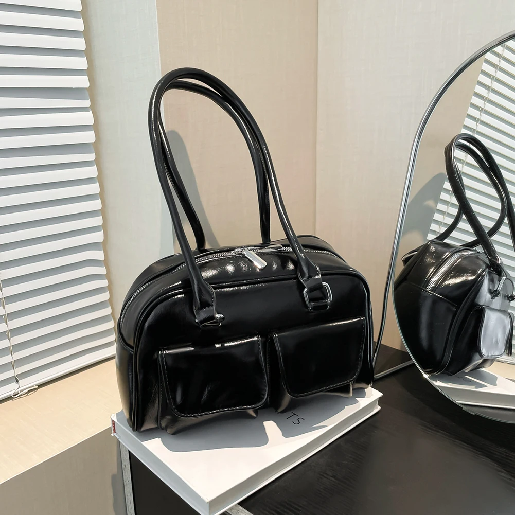 Retro Solid Bowling Bag Women’s PU Leather Vintage Shoulder Bags Multi pockets Tote Handbag Large Capacity Underarm Bag Hobo Bag