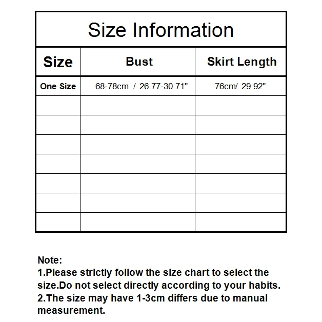 One Size: Bust 68-78cm(26. 77-30.71″), Skirt Length 76cm(29.92″)