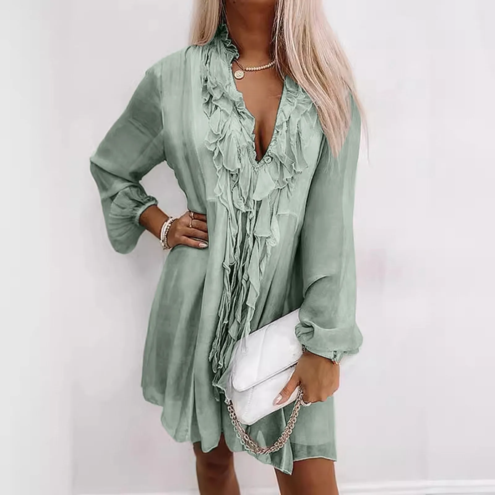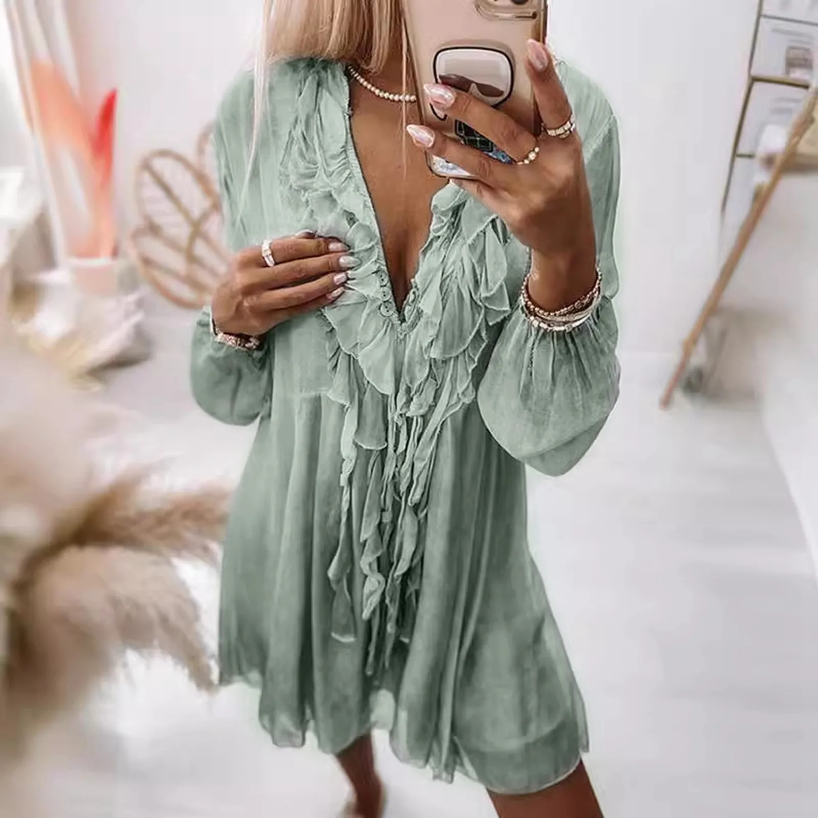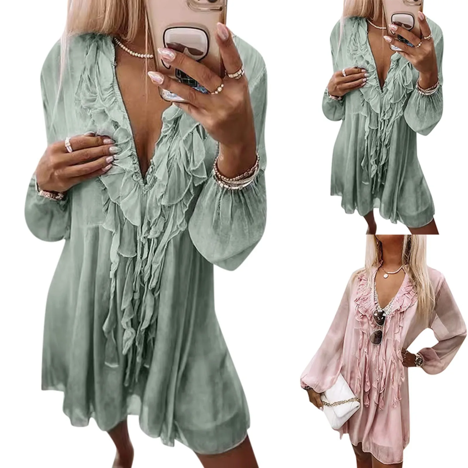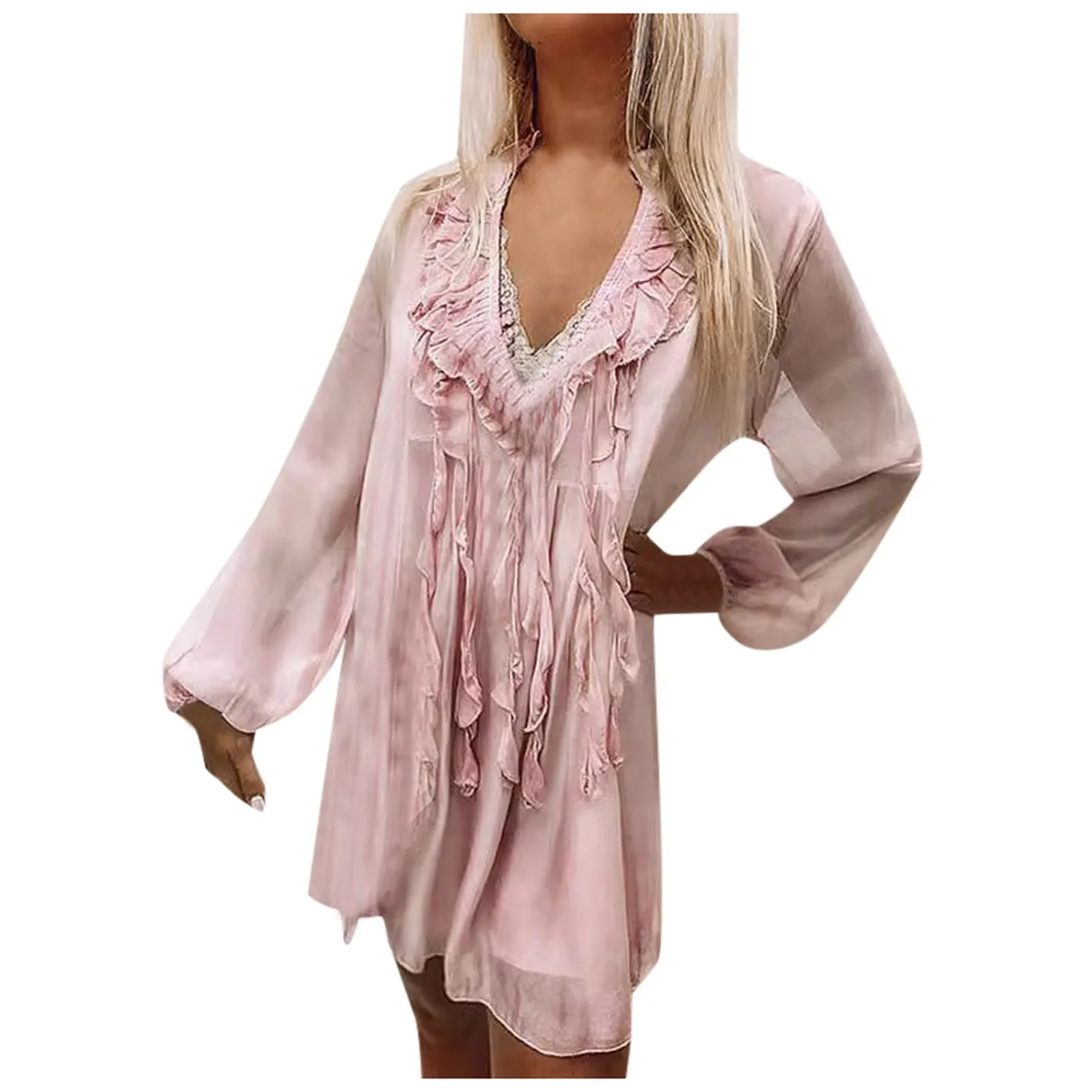 Summer Beach Style Ruffles Tassel Tie Up Pink Dress for Women Elegant Sexy V-neck Loose Fit Holiday Party Dress Chiffon