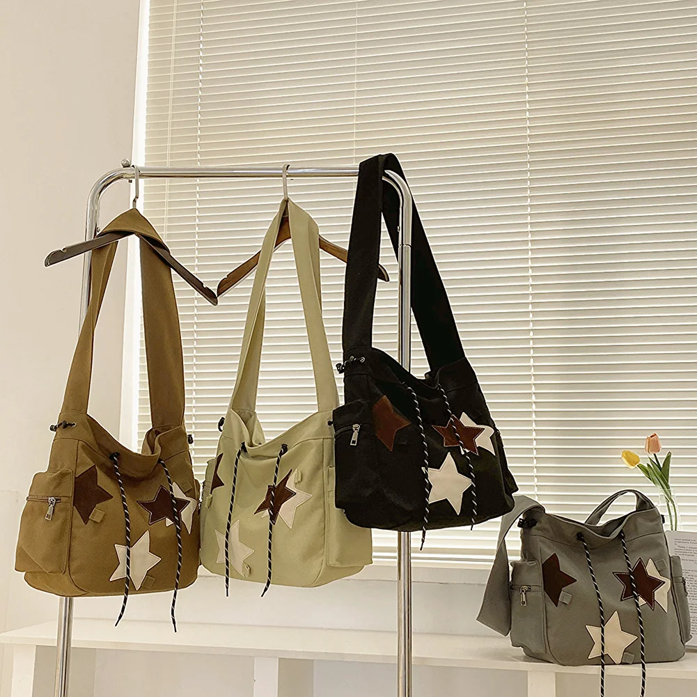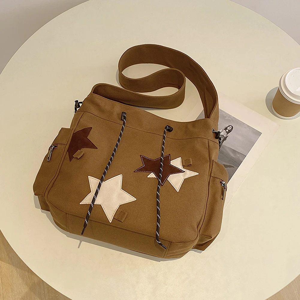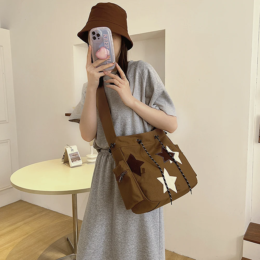 Women Casual Satchel Bag Large Capacity Canvas Cute Messenger Bag Star Applique Y2K Street Style School Bag for Teens Students