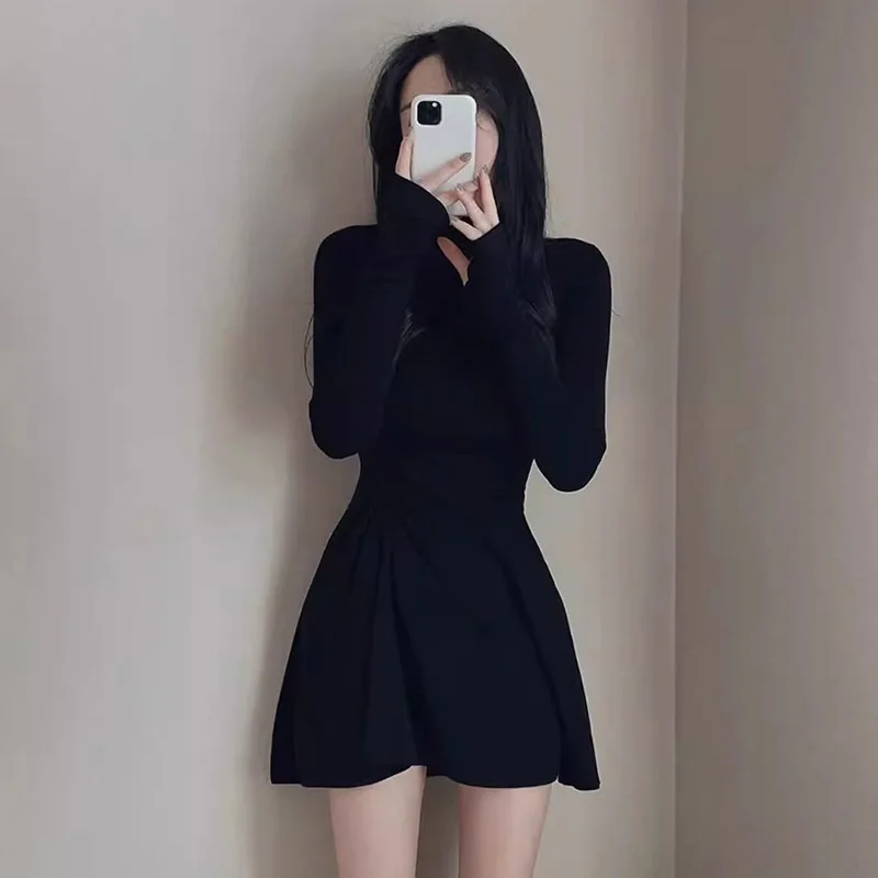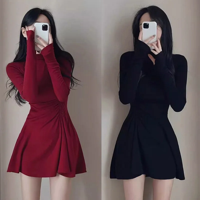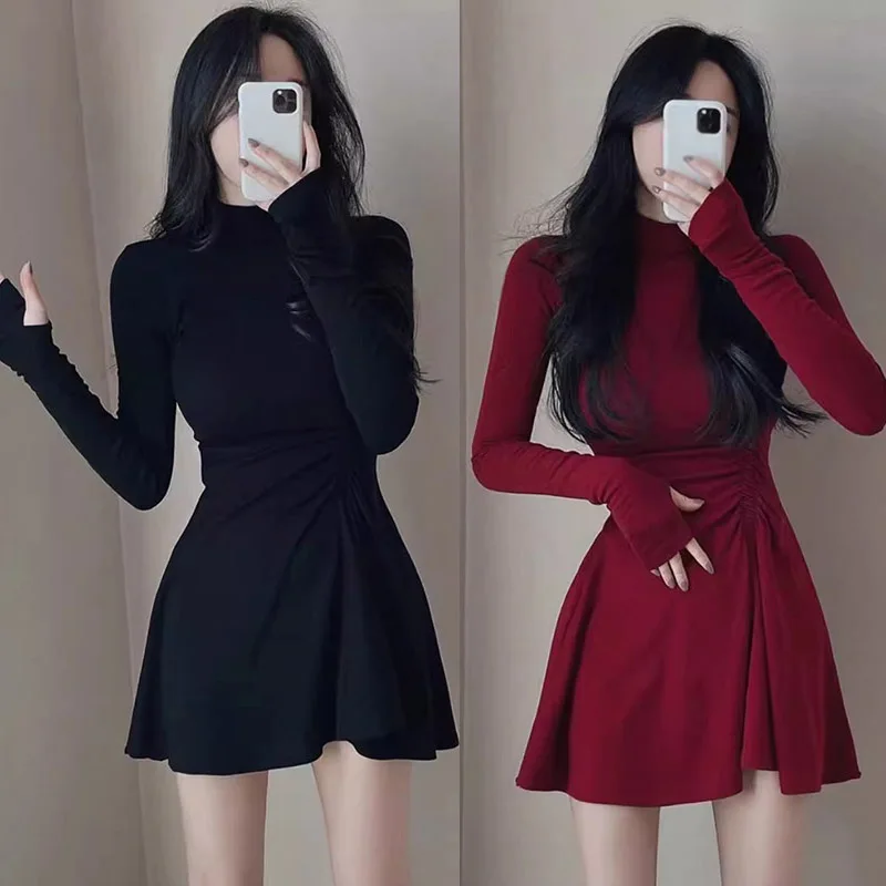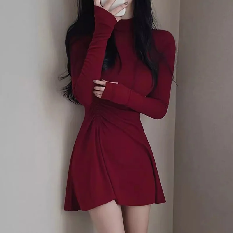 Women Dress Christmas Chinese New Year Half-Height Neck Simple Solid Color Sweet Slim Long Sleeve Dress