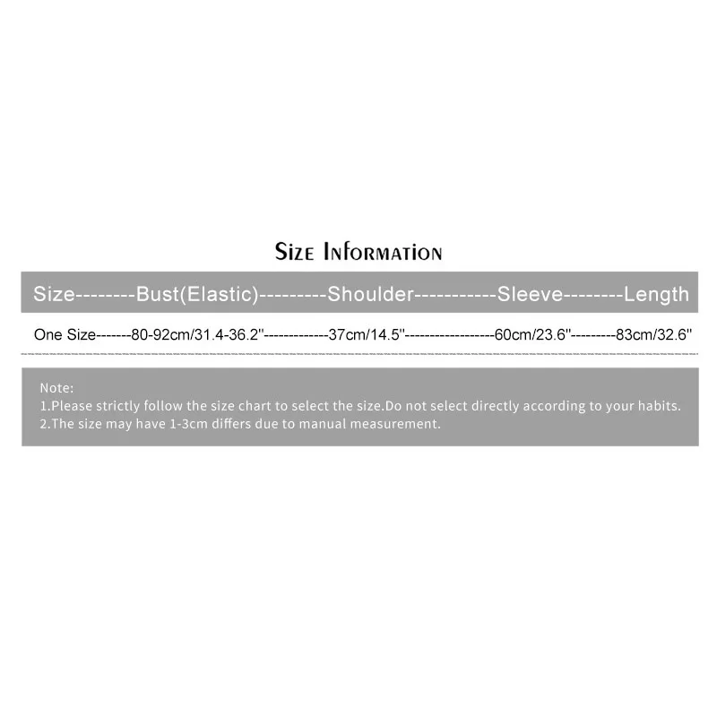 Size———–Bust(Elastic)———— Shoulder———Sleeve——–Length