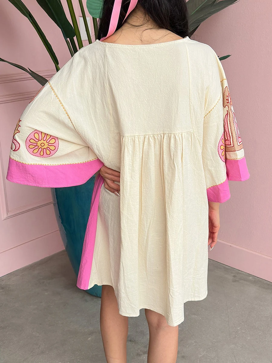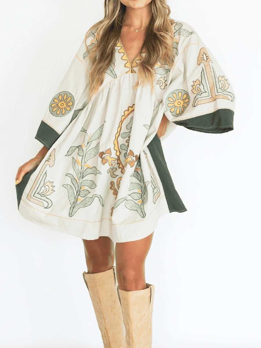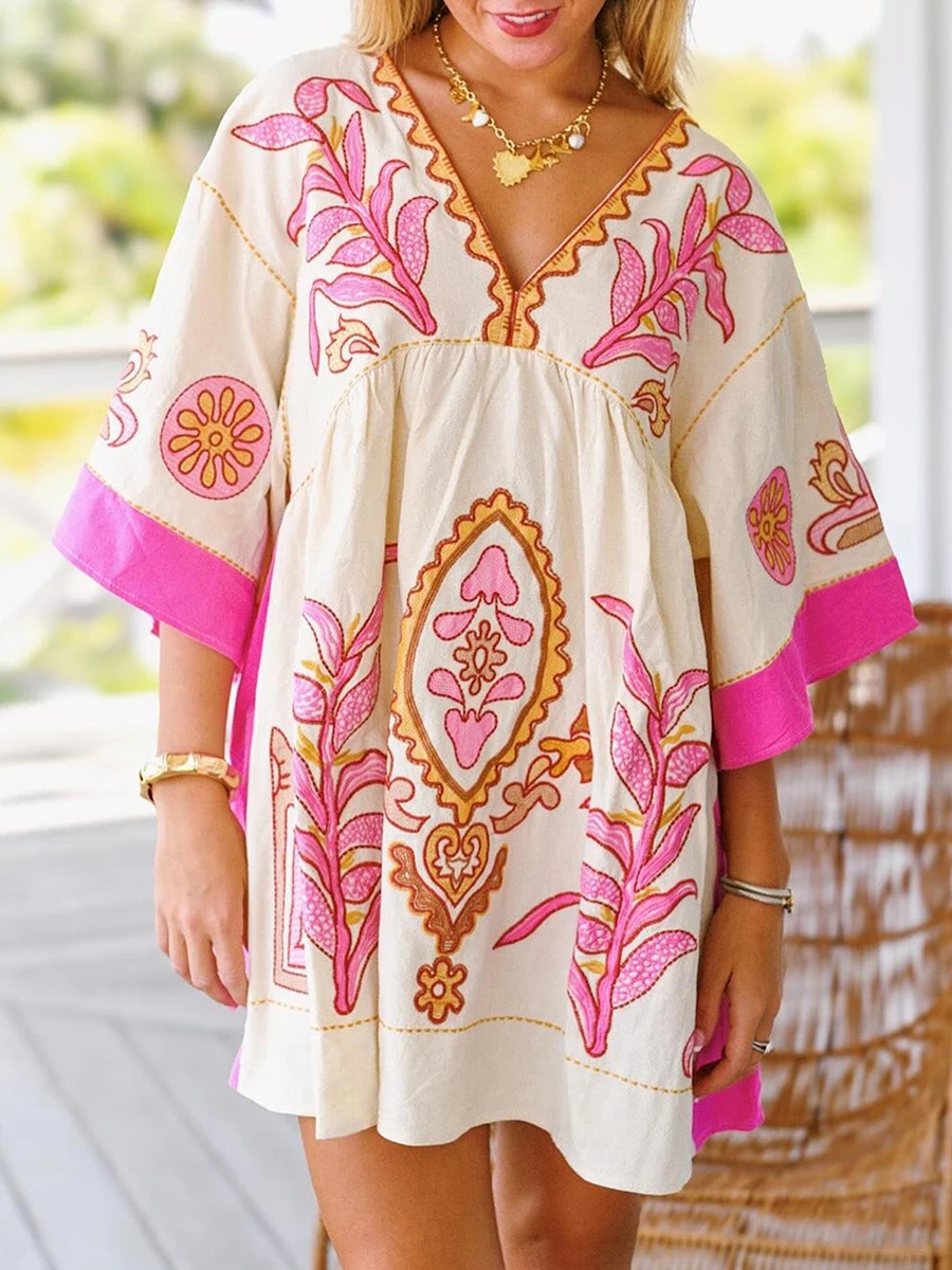 Women’s Summer Floral Print Dress Half Sleeves V-Neck Loose Fit Short Dress for Beach