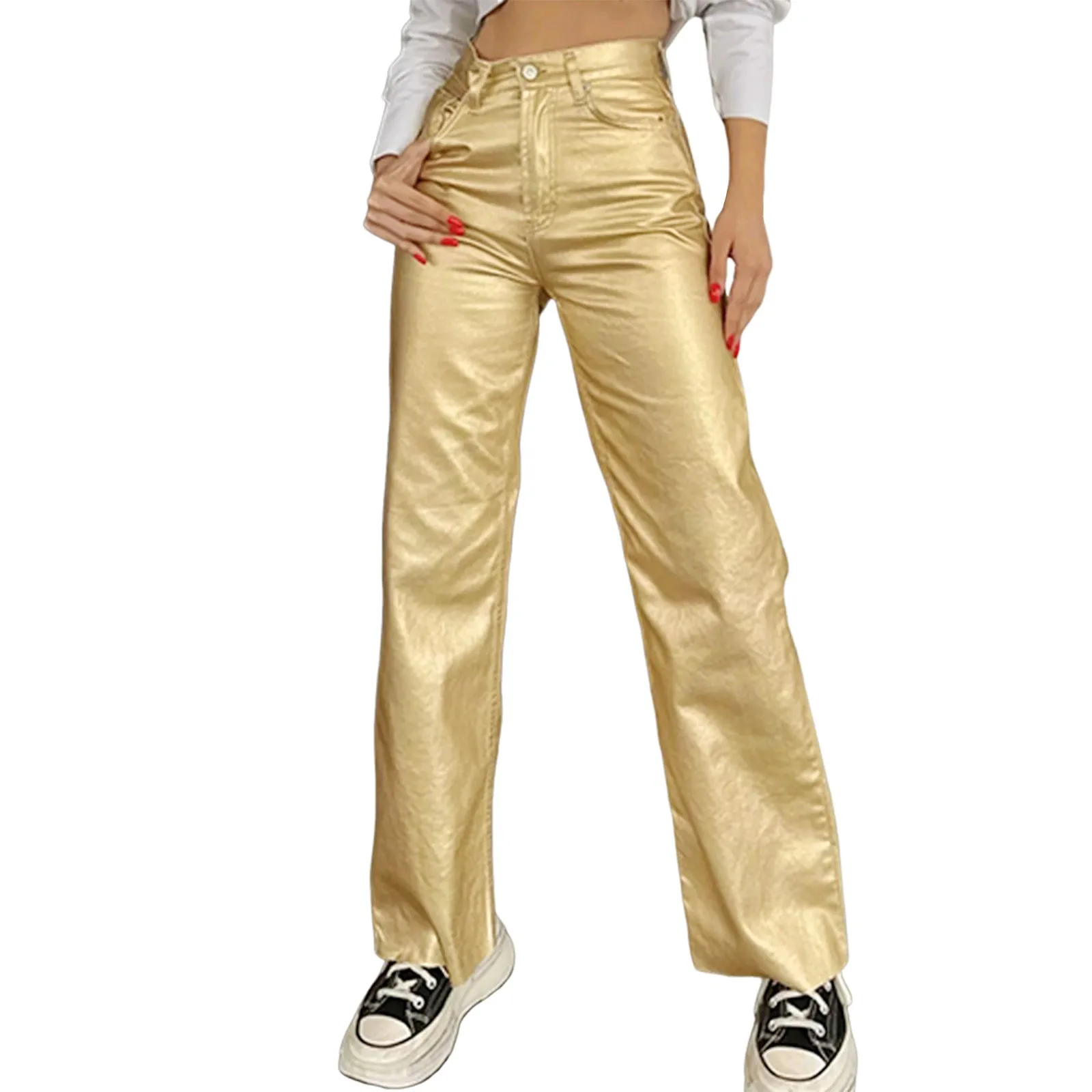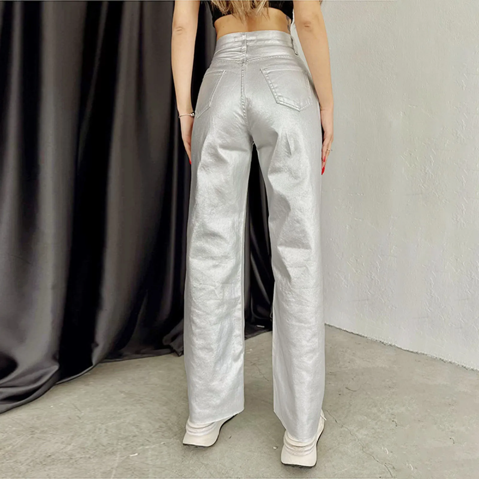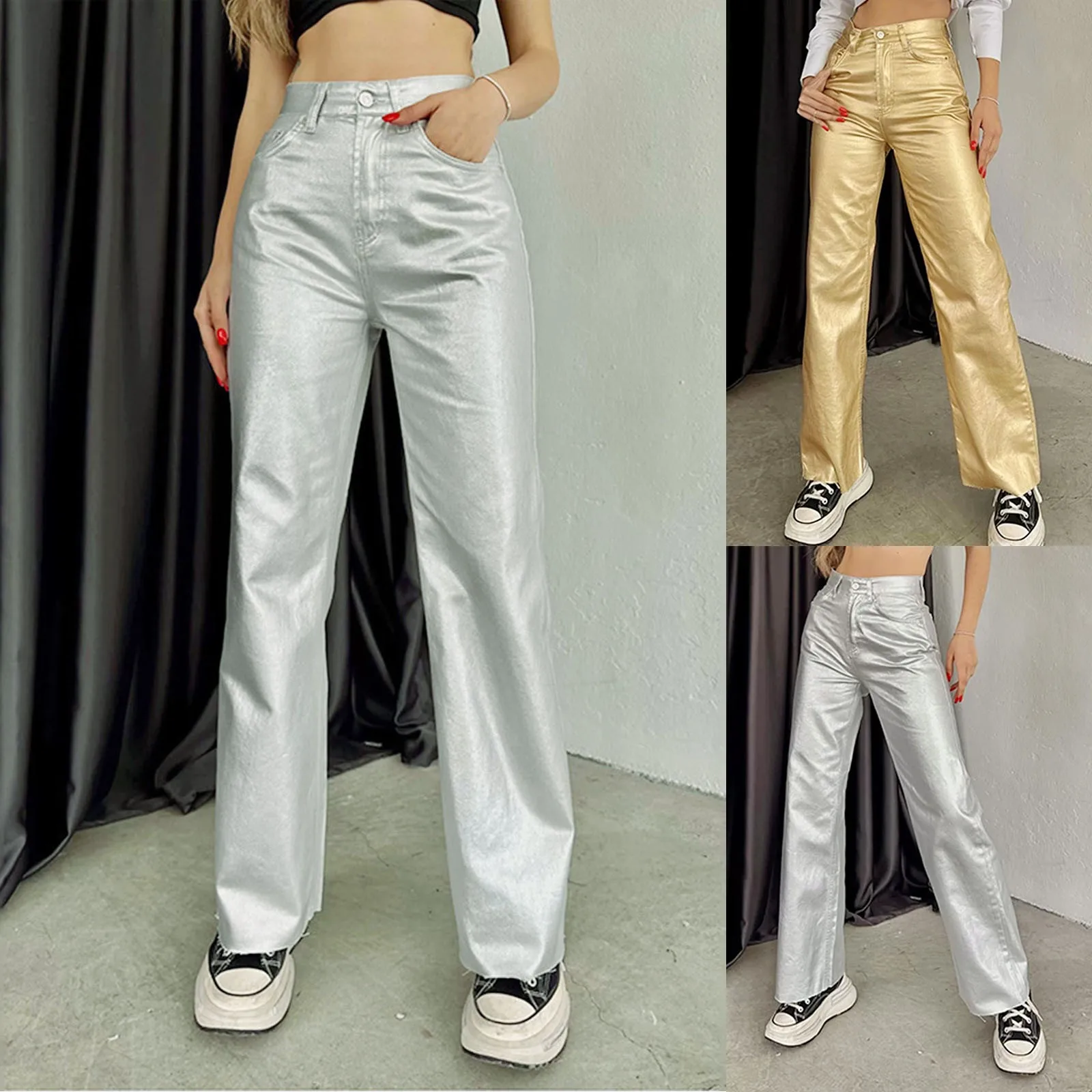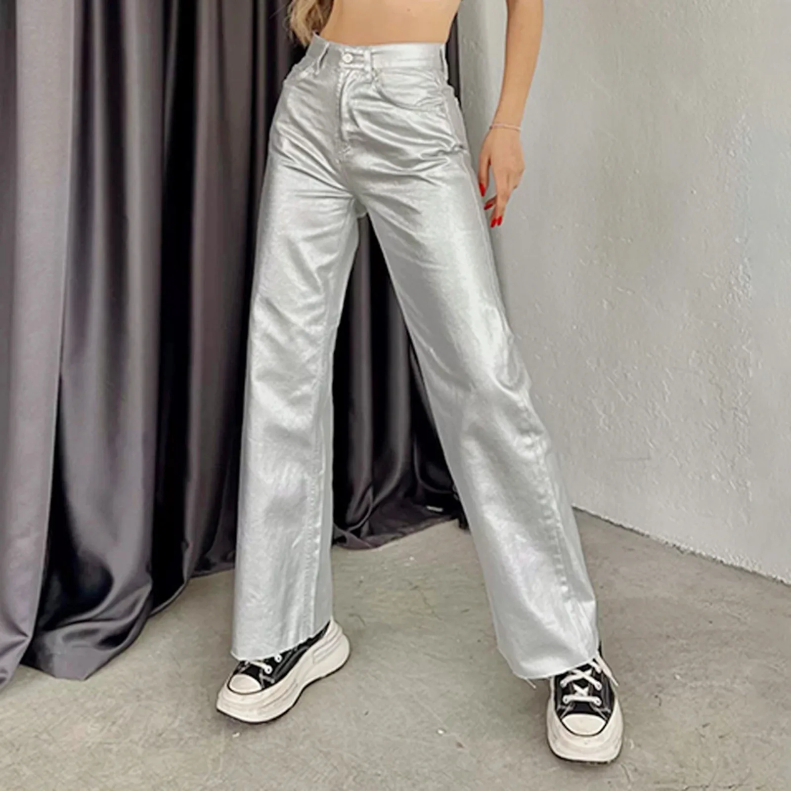 Women’s Fashion Gold Silver High Waist Straight Pants Vintage Pockets Elegant Loose Fit Women’s Shiny Pants Trousers