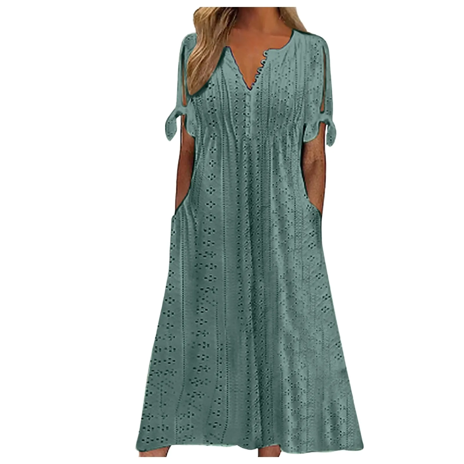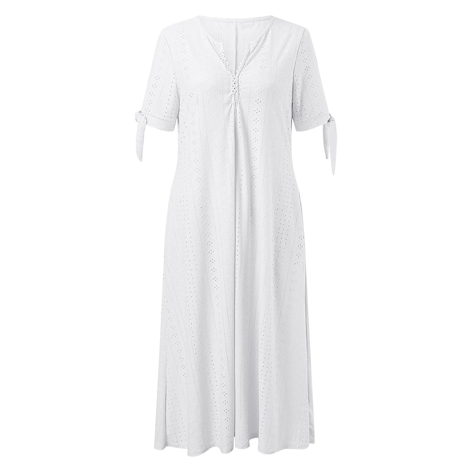 Women’s Casual Pleated Dress Solid Lace Hollow Button Pocket Dress Bow Short Sleeve V Neck Midi Dress
